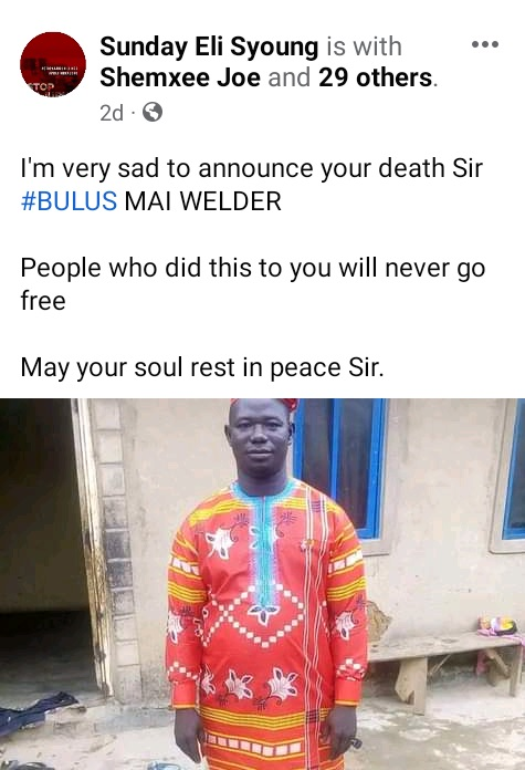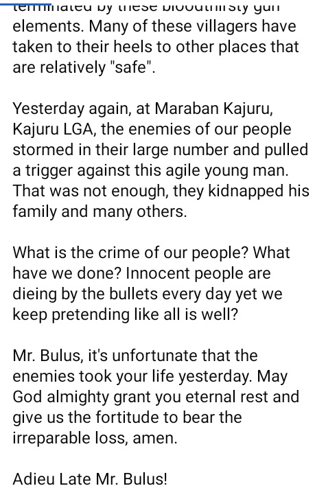“Mr. Bulus, it’s unfortunate that the enemies took your life yesterday. May God almighty grant you eternal rest and give us the fortitude to bear the irreparable loss, amen. Adieu Late Mr. Bulus”