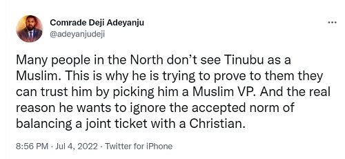 “Many people in the North don’t see Tinubu as a Muslim. This is why he is trying to prove to them they can trust him by picking him a Muslim VP. And the real reason he wants to ignore the accepted norm of balancing a joint ticket with a Christian.”