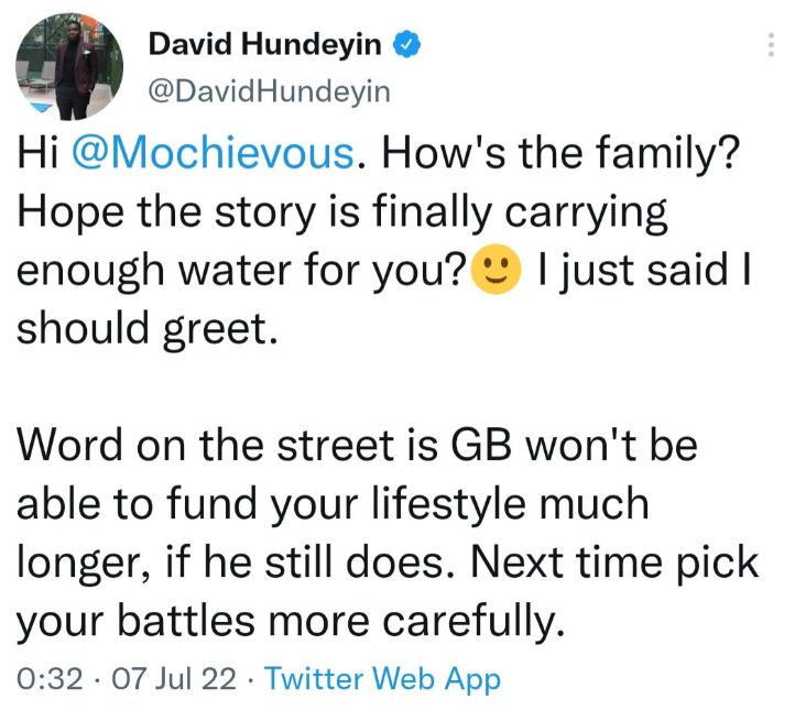 ”Ah good evening David, family is well. Yours? I would have continued to ignore you like I’ve always done but I also know how dangerous a tweet like this can be. 1. “her lifestyle is being funded by a man” is pretty old material. This is 2022 2. Leave my name out of your mouth”
