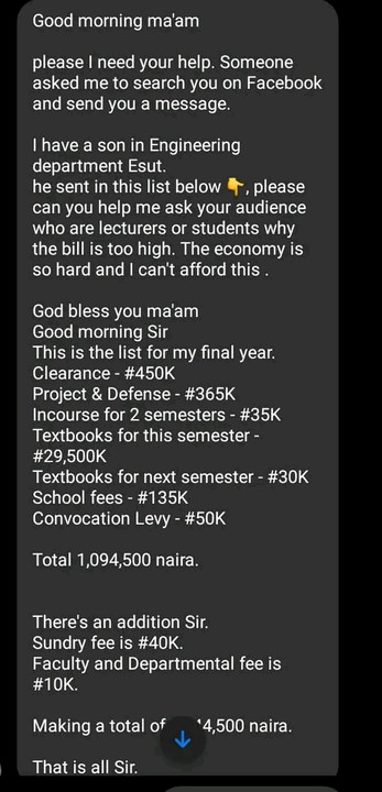 In a Facebook post, the lady who is currently based at Abuja pleaded with Enugu residents to confirm if the actual price list sent to her by her son schooling at the Enugu state University of Technology was true.