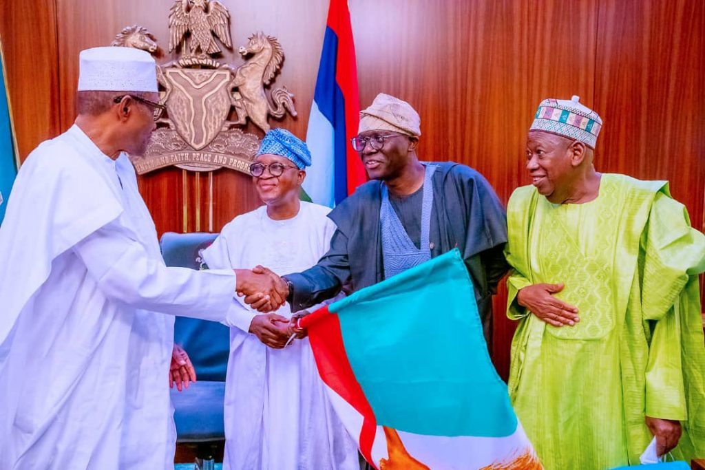 Osun 2022: President Buhari Presents APC Flag To Oyetola, Sanwo-Olu And Ganduje
